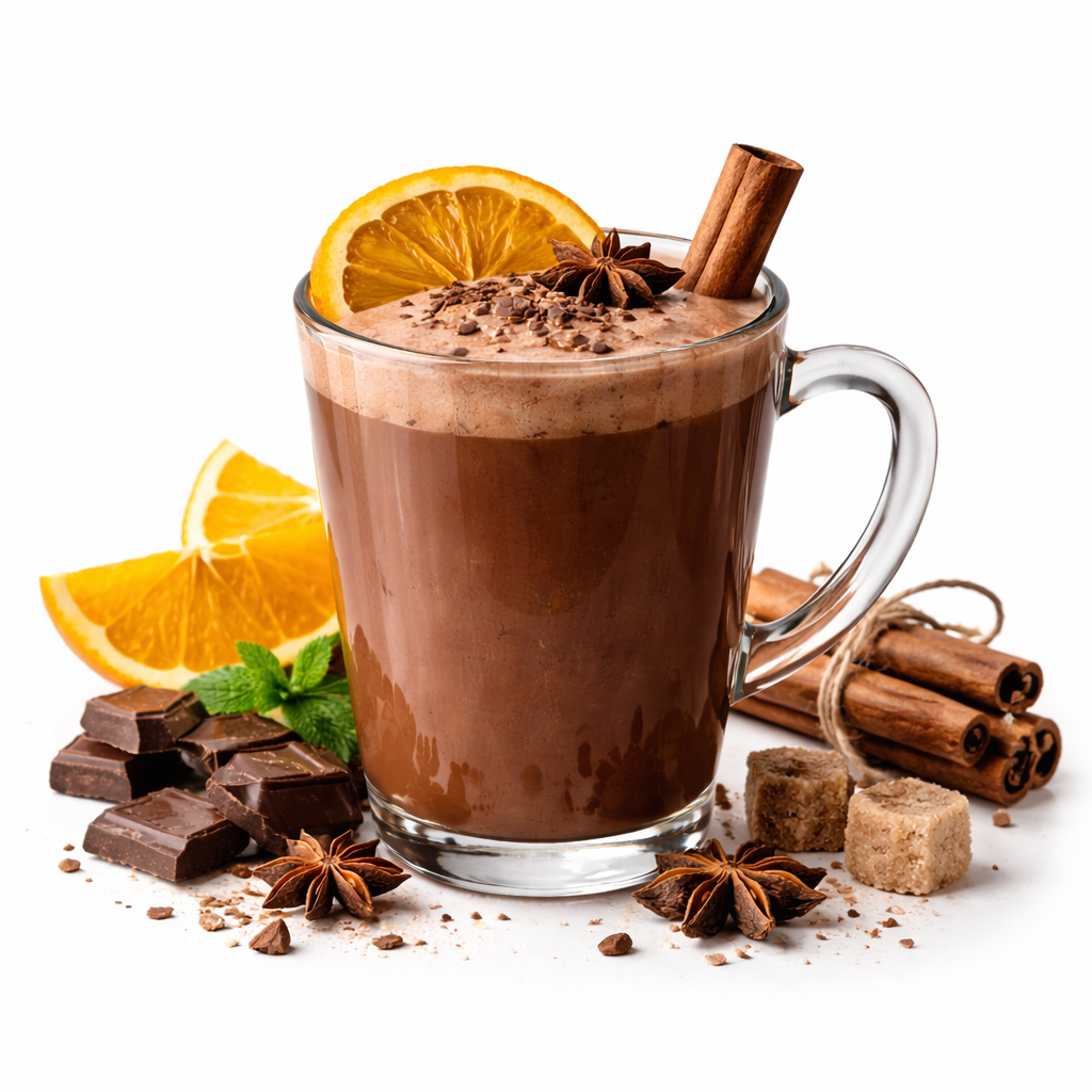 Ciocolată caldă fină, aromată cu scorțișoară și portocală, perfectă pentru momente de răsfăț și relaxare.